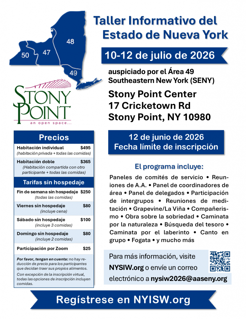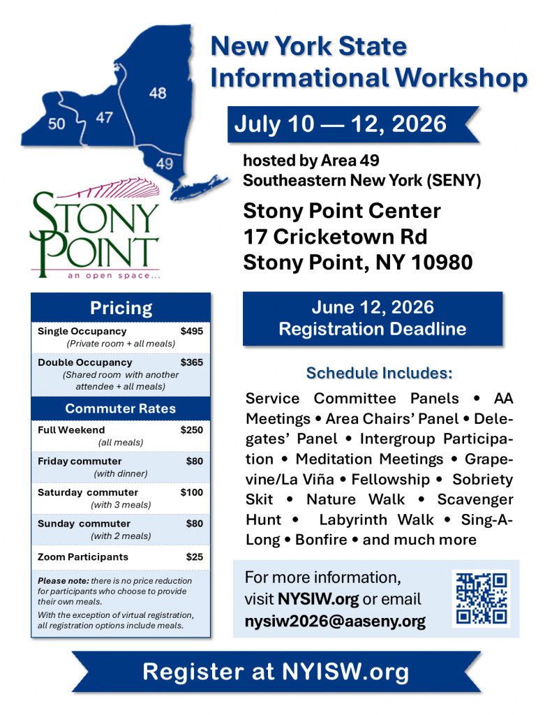 The purpose of the New York State Informational Workshop is to share information about our Area Committee work with our area counterparts across the state. Committee Chairs, Area Chairs, and Delegates from Areas 47, 48, 49, and 50 come together for a weekend of panels, presentations, meetings and fellowship. All A.A. members and their guests are welcome!